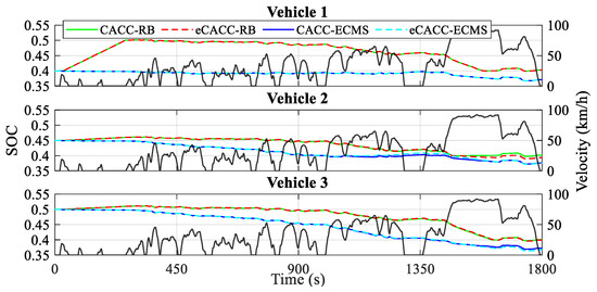 As shown in Figure 12 and Table 2, the initial SOC is different for each of the three vehicles; however, the different control methods in each vehicle result in different ending SOCs. Specifically, compared to RB, ECMS embodies a lower ending SOC, with a difference of almost 4% between them in vehicle 3. Meanwhile, such a difference in battery SOC leads to less energy consumption by ECMS, as shown in Figure 13. This is because taking on more of the power demand from the battery increases the chances of rationally regulating the operating states of the fuel cell, leading to significant economic payoffs. Moreover, with the eCACC strategy, the energy-saving efficiency of vehicles 2 and 3 is improved by about 1.5% compared with CACC, and the comprehensive optimality reaches almost 5% for vehicle 3, which fully verifies the effectiveness and strong impetus injected into the exploitation of energy-saving potential by combining centralized and distributed controllers.