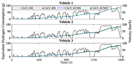 In order to verify the economic performance in general, several static metrics for each vehicle obtained from the simulation are presented, including the battery SOC curves in Figure 12, the equivalent hydrogen consumption curves in Figure 13, and the economic comparison results in Table 2.