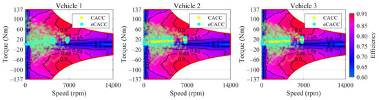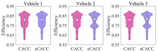 Figure 14 displays the distributions of the motor operating states. Note that the darker the color of the motor’s operating point in the diagram, the greater its frequency. It was found that compared to the leading vehicle, the following vehicles experience lower peak motor torque, which benefits from smoother longitudinal operation of the following vehicles under the car-following strategy. Meanwhile, for following vehicles, the motor in eCACC operates more in its high-efficiency region, especially when the motor torque is below 30 Nm. In order to more clearly express the distribution of the motor’s operating state, Figure 15 shows the frequency distribution of its operating efficiency. It can be noticed that the eCACC has the superior performance of transferring the operating state of the motor with an efficiency between 78% and 85% to an efficiency of 85% or more, thus exhibiting an average motor efficiency improvement of about 2%. As such, eCACC in the centralized controller can offer reference datasets with comprehensive optimization information for the distributed controllers, thus guaranteeing the economic improvement of eHCACC.