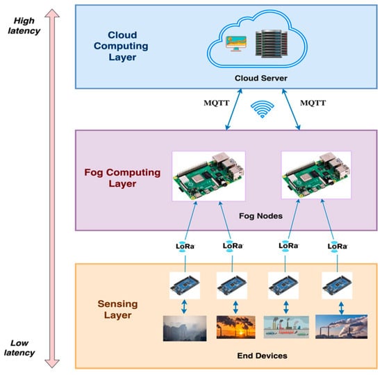 The proposed FAQMP system adopts a three-layered architecture: the sensing layer at the bottom, the FC layer in between, and the CC layer at the top, as depicted in Figure 2. Each layer has distinct functionalities that collaborate to achieve an efficient end-to-end IoT system, managing data processing and analysis across different layers. The architecture is explained in detail as follows: