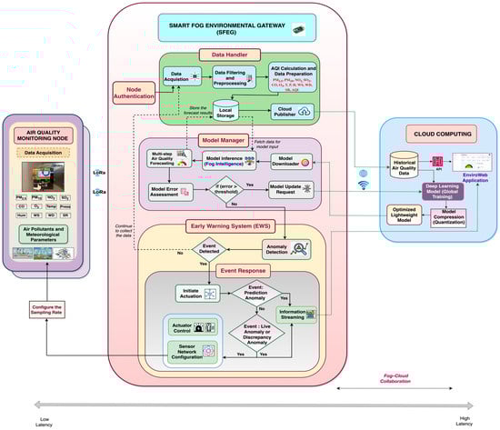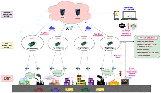 The proposed FAQMP system features a hierarchical, three-layered architecture with the sensing layer, the FC layer, and the cloud (CC) layer. At the sensing layer, an AQM node is equipped with a customized PCB and low-cost sensors to acquire the major air pollutants data that contribute to Air Quality Index (AQI) levels, including particulate matter 2.5 (PM2.5), particulate matter 10 (PM10), nitrogen dioxide (NO2), sulfur dioxide (SO2), carbon monoxide (CO), ozone (O3), and meteorological data, including temperature, pressure, humidity, wind speed (WS), wind direction (WD), and solar radiation (SR). This data is transmitted to the FC layer via LoRa, a Low-Power Wide-Area Network (LPWAN) technology known for its long-range capabilities, cost-effectiveness, and low power consumption [13,14]. The FC layer utilizes Raspberry Pi 3 Model B+ [15] as the Smart Fog Environmental Gateway (SFEG) embedded with Fog Intelligence. The SFEG processes and manages data, provides real-time forecasting, and supports decision making. It includes an Early Warning System (EWS) that detects anomalies and triggers alerts, enabling preemptive actions and rapid responses. The processed data are then sent to the cloud for long-term storage and complex analysis using MQTT. Additionally, the EnviroWeb application provides users with real-time air quality data, forecasts, trends, and alerts, helping them make informed decisions and improve public health and safety.