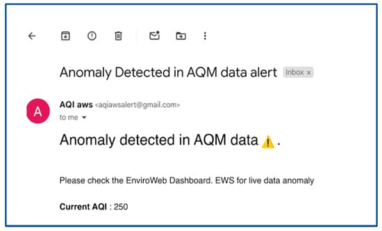 - Information Streaming: Timely alerts or notifications are sent to users via channels such as email, SMS, and EnviroWeb dashboards. This is crucial for providing immediate information about any detected anomalies, particularly those related to dangerous air quality levels. For testing purposes, we simulated a fire event where the AQI levels increased in the live data. This simulated spike activated the event response module, triggering an immediate reaction. As a result, an email alert was generated and received, as shown in Figure 6, demonstrating how the system works in real time to notify stakeholders about hazardous air quality conditions.