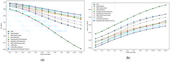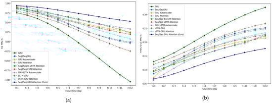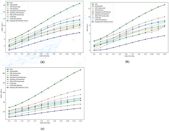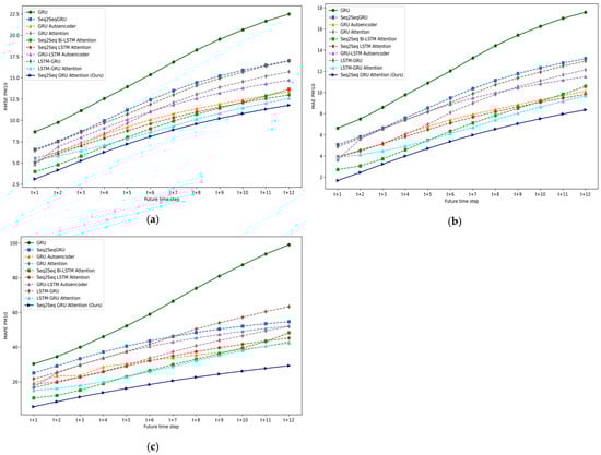 Despite the widespread adoption of encoder–decoders in multi-step forecasting, a limitation arises due to the potential loss of temporal information as the length of the input sequence increases during compression into a context vector with fixed-length encoding. To tackle this challenge, attention mechanisms are integrated into encoder–decoder models [71,72], enabling the model to focus on specific segments of the input sequence using attention weights and thus mitigating the risk of information loss. This mechanism assigns relative importance to each hidden state in the encoder, allowing the decoder to select relevant information from the input sequence to generate the output. It plays a crucial role in effectively extracting essential features and capturing long-range dependencies in long time series data, resulting in enhanced performance for multi-step forecasting. For instance, Dairi et al. [47] proposed a Variational Autoencoder (VAE) with multiple directed attention that outperformed RNN model variants in forecasting CO, NO2, O3, and SO2. Chen et al. [73] proposed the STA-LSTM, which incorporates an extreme value attention mechanism to mitigate the influence of sudden changes in air quality prediction. Li et al. [74] proposed an attention-based CNN-LSTM model that integrates an additional attention mechanism layer to capture spatiotemporal characteristics in the input data, demonstrating improved performance over the standard CNN-LSTM architecture. Du et al. [75] proposed a novel temporal attention encoder–decoder model based on Bi-LSTM to adaptively learn long-term dependencies and hidden correlation features for multi-step forecasting. Jia et al. [76] implemented a Seq2Seq framework with an attention mechanism to predict O3 for the next 6 h.