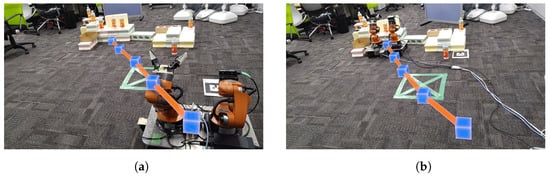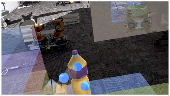In our previous paper [], we integrated object manipulation in MR space and robot movements in the physical space, allowing the users to intuitively control MR objects. The robot detects the changes in the position and orientation of MR objects based on the user’s manipulations and moves the arm according to the user’s movements in the physical space. Additionally, we visualized real objects as MR objects and built a calibration system that integrates maps between the user and the robot using AR markers and affine transformation.