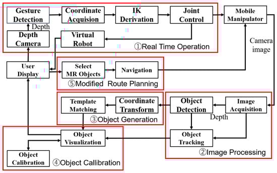 The robot employed in this paper is KUKA YouBot, which is a mobile manipulator equipped with a 5-axis robotic arm with a two-finger grip and can move in all directions. On the robot side, changes in the position and posture of objects in MR space are detected and reflected in the robot’s movements in the real space, enabling smoother communication between the human and the robot. In addition, the robot’s movements are reflected on the MR space to provide accurate visual feedback. The system architecture, which consists of four modules, is shown in Figure 2.
