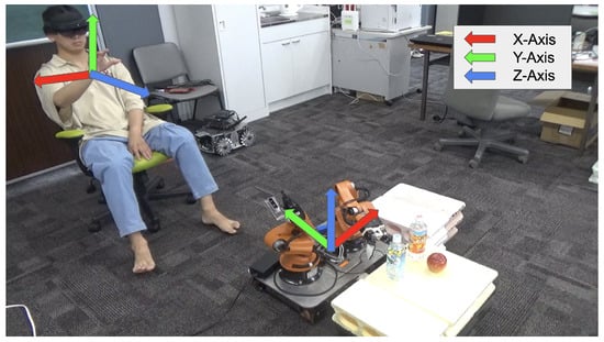 Expectations have been increasing for human–robot interaction using mixed reality (MR) []. One such research is the development of a dynamic object grasping system for human–robot cooperation, which leverages MR to seamlessly integrate real and virtual elements, thereby enhancing the interaction and effectiveness of collaborative tasks []. MR extends the capabilities of AR’s virtual overlay and VR’s immersive environments by weaving virtual and physical elements into a cohesive experience. This seamless integration facilitates rich visuals and interactive collaboration within MR spaces, promising a higher level of immersion [,]. Research is also being conducted to create a highly immersive experience by directly mapping human movements onto a robot in MR space [,]. By directly mapping human movements to robot movements in MR space, humans can control robots through physical intuition. However, if the objects are far from the work area or the robot and the human have different viewpoints, it would be difficult to understand the relationship between the placement of objects and the distance in the physical space by simply reflecting the robot’s movements.