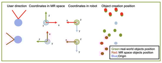 In the initial setup, the origin of MR space and the origin of real space must match. With the origin of MR space defined as the origin on the HoloLens2 camera, MR objects are generated in MR space using coordinates from the origin. However, when a user makes an action to grasp an MR object with his/her arm it will cause a misalignment between the MR objects and the real objects. There are two main causes for this misalignment. The first cause is the misalignment of the object when the user sets the origin. If the MR object was placed at the origin of YouBot coordinate in order to match the user and robot coordinate origins, the position of the MR object will change depending on the robot’s movement and the MR object’s position. This tends to cause a misalignment of the position from the origin. The second cause is due to the difference in the timing of setting the origin of HoloLens2 and YouBot. HoloLens2 automatically sets its coordinate origin when the application is launched. Therefore, it was necessary to launch the application by aligning the orientation of the user and the robot. In this way, as shown in Figure 4, the orientation differs between MR space and real space depending on the orientation each time the application is started.