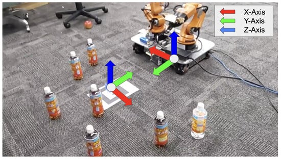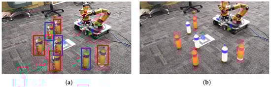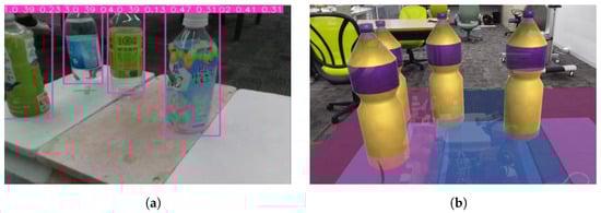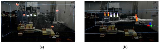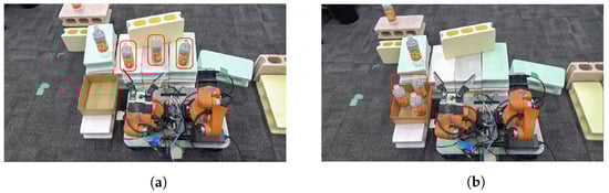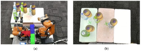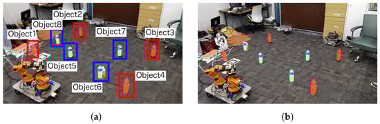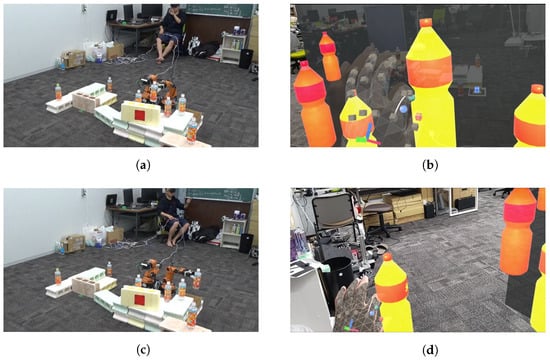 Eight objects were placed, and the algorithm above (9) was used to verify the misalignment between the MR object and the real object five times. The objects were all the same type of plastic bottles and placed randomly. The object circled in red in Figure 17a is the object used to calculate the affine transformation matrix. The selection of the objects for calculating the affine transformation matrix is determined by the user. The user operates the system so that the objects surrounded by a red frame are superimposed on the real objects. The four objects surrounded by a blue frame are the targets for position calibration. The number of objects surrounded by the blue frame can be increased or decreased. The coordinates of the objects are based on the coordinates of the AR markers. The AR markers are placed in positions where the robot can detect them without moving.