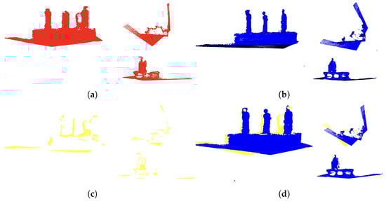 - Point cloud merging and delivery: The non-overlapping point cloud is merged with the existing point cloud and updated by . Acquired point cloud is then delivered to the MR device, and the point cloud is added on the MR space. This process efficiently integrates consecutive point cloud data and enables the generation of detailed real-time point clouds. Figure 7 shows an example of merging two point clouds, where the number of points in the point cloud is 122,147 and the number of points in the point cloud is 117,037, and simply adding them together gives 239,184 data points. On the other hand, the number of points in non-overlapping point cloud is 14,552, and the number of points in point cloud (d) is 131,589. This shows that the point cloud processing of HoloLens2 has become lighter.