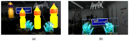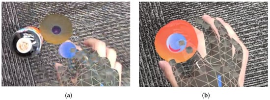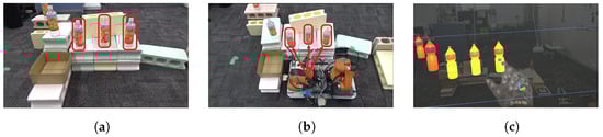 This processing flow uses as input the RGB and Depth images obtained from Realsense, attached to the tip of the YouBot’s end-effector, the joint angles of each joint of the YouBot, and the user’s hand movements. Yolov5 is used to detect physical objects (Figure 6a) and DeepSORT is used to track the objects. Using this depth information, the camera coordinates are transformed to world coordinates, the depth center of each bounding box is obtained, and the homogeneous transformation matrix of each joint is used to transform the camera coordinates to YouBot’s base coordinates. In this way, the positional information and IDs of physical objects are placed in the virtual space as MR objects, and the positions and IDs of the physical objects are continuously updated. The update of the position and ID of the physical object stops when the user picks the MR object and resumes when the user selects the MR object again. The MR object is generated at an angle of 10 to 20 degrees from the horizontal plane, taking into account the natural head movements of the user during interaction (Figure 6b). By visualizing the placement of MR objects in MR space, it becomes easier to deal with difficult-to-see placements.