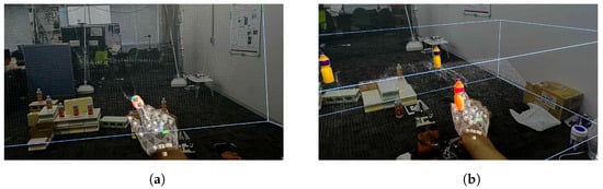 Figure 19 illustrates an example of a pick-and-place experiment using the proposed system. In this task, the robot is required to place three randomly positioned bottles within its grasp range into an adjacent box. The task is considered successful if all three bottles are correctly placed in the box. This study supposes that the user can perceive the task environment. Additionally, we restrict the task area, and the point cloud data volume is uniformly reduced to avoid affecting the sense of operation. As shown in Figure 20, experiments were conducted to evaluate the effects of different perspectives and the distance between the user and the robot. Specifically, we deal with two experimental conditions where (1) the user and the robot are facing the same direction at a distance of 2 m (Figure 20a) and (2) the user and the robot are facing different directions at a distance of 6 m (Figure 20b). These experiments aim to assess how the differences in perspective and the distance between the user and the robot affect the performance of the pick-and-place tasks.