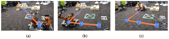 Once the user completes the route modification, the system immediately communicates the new route to the robot; then, the robot efficiently moves towards the target destination following the updated path. In this study, we utilize Lidar SLAM for mapping dynamic environments during robot movement. This process demonstrates the system’s capability to swiftly respond to a sudden environmental change and occluded obstacles from the user. This approach allows the user to experience interactions that cross the boundaries between the real and virtual worlds, enabling more intuitive and flexible route planning. If the robot encounters unknown obstacles during autonomous movement, the user can intervene in real-time and adjust the robot’s path accordingly. This ensures that the robot can be controlled as intended by the user even if the mapping is incomplete.
