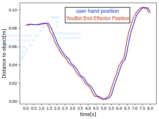 In Equation (22), represents the joint angles’ estimated vector at iteration k. is the Jacobi matrix for the error vector , which indicates the discrepancy between the position of the robot arm and the target position. is the damping factor, and comprises diagonal elements. If YouBot and MR space have different coordinate systems, the transformation using Equation (1) will accurately update YouBot’s joint angles in MR space and provide accurate visual feedback. For gripper operation, the coordinates of the user’s left index finger and thumb tips are monitored. The system sends open and close commands based on the distance variation between these two points, controlling the gripper’s action. Once a command is received, the gripper’s servo motors operate accordingly. This interactive system enables intuitive robot control through user gestures, assigns spatial significance to these gestures, and enhances the user–robot interface. Additionally, to ensure safety under real-time control, we restrict the movements of the robot arm to avoid collisions with other mechanisms and structures. The system’s real-time response to a user movement was validated, demonstrating that the YouBot arm can track the motion of the user hand within 0.2 s, as illustrated in Figure 16. The red line represents the position of the user’s hand and the blue line represents the position of the end-effector of YouBot’s arm. This rapid response time allows target coordinates and orientations to be seamlessly shared between the user and the YouBot arm in MR space. Consequently, the user can monitor the movements of the YouBot arm in the real world while operating within the MR environment, simplifying the execution of complex tasks. Moreover, the shared spatial context between the user and the robot gives gestures meaningful spatial meaning, making gesture-based control of the robot more intuitive. This symbiosis of user and robotic movements within a shared space highlights the effectiveness of the system in facilitating natural, efficient human–robot interaction.