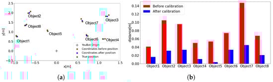 Comparison of the object positions before and after calibration: (a) Before calibration. (b) After calibration.