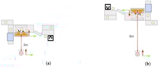 In this research, the center coordinate of the robot is taken as the origin of the robot, and the position and orientation at which the application is started are taken as the origin of the MR space. The origin of the robot and the origin of the MR space are transformed into a global coordinate system with the floor as the origin. Figure 5 shows the position and coordinate system of YouBot and the position and coordinate system of AR markers. In MR space, Vuforia developed by PTC Inc. is used to detect AR markers. In real space, we use AR_Track_Alvar, an open-source AR tracking framework. To align the MR space with the coordinate system of YouBot, we calculate the rotation matrix and translation vector using the previously presented formulas and perform a coordinate transformation. This ensures that the MR space and YouBot’s position and coordinate system match. The coordinate system of the AR marker is used as the coordinate system of the MR space, and the coordinate system of the real robot is fixed so as to match the coordinate system of the AR marker and the real robot.