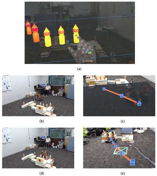 As shown in Figure 21a,b, the point cloud and objects are acquired first. Then, the viewpoint is switched between a side view and a top view, as shown in Figure 21c,d, aligning the positions of four objects in the point cloud (real space). The affine transformation matrix is obtained using the positions of four objects before and after the movement, and the positions of the other three objects that have not been moved are corrected. The positions of the objects before calibration are shown in Figure 21e and the positions after calibration are shown in Figure 21f. Next, as shown in Figure 22a, the object to be moved is touched in the MR space. The position information of the touched object is used to calculate the goal position of the robot to move and a path is generated, as shown in Figure 22b,c. The user can adjust the generated path in the MR space. Then, the robot moves along the path to the task environment, as shown in Figure 22d,e. The user can adjust the MR space by scaling and rotating it to achieve a suitable MR space for performing operations, as shown in Figure 23. When the user grasps the MR object, as shown in Figure 24a,b, the robot also grasps the real object. Similarly, when the user releases the MR object, the robot also releases the real object, as shown in Figure 24c,d. This procedure is used to perform the pick-and-place task. In order to verify whether the user can operate the robot intuitively, the task is repeated about 10 times. We evaluate the success rate and the task execution time from the start of the task.