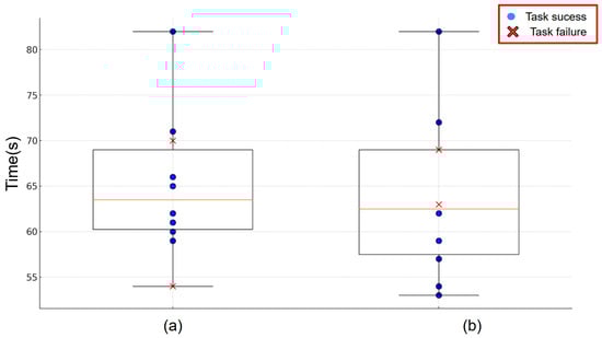 Figure 25 shows the box-and-whisker plot of the comparison that visualizes the distribution of task execution time for the pick-and-place experiments conducted under two different conditions. The box-and-whisker plot displays the minimum, first quartile, median, third quartile, and maximum values of the execution time, providing a comprehensive summary of the data distribution. In this figure, the circles indicate the successful trials (task success) while the crosses indicate unsuccessful trials (task failure). As shown in Figure 25, in the case of experiment (a), which was conducted from the same perspective and at a near distance to the robot, the average execution time was 65.0 s and the maximum execution time was 82 s. The success rate of case (a) was 80%. On the other hand, in experiment (b), conducted from a different perspective and at a far distance to the robot, the average execution time was 64.0 s and the maximum execution time was also 82 s. The success rate of case (b) was 70%.