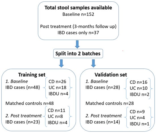 A flow chart summary of stool samples analysed from children with IBD and non-IBD-matched controls.