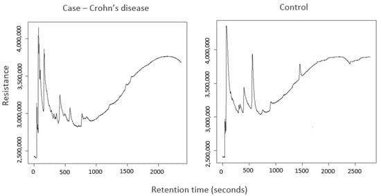 The performance of each classifier model is dependent on the group comparisons being made. Further details of the classifiers used and the scheme for cross-validation using this pipeline have been described previously [21]. However, in general, the SVML classifier with LOOCV for validation is the overall best performing model in the validation datasets to generate values for accuracy, sensitivity, and specificity for all comparisons. We have chosen to report one model across all comparisons rather than the best model for each comparison to avoid bias. A list of group comparisons is summarised in Supplementary Table S3. The results for all training models are reported in Supplementary Tables S4–S7, and all validation models are reported in Supplementary Tables S8–S11. An example of the OdoReader© chromatogram profiles is shown in Figure 2 for a case (Crohn’s disease and a control (functional constipation).