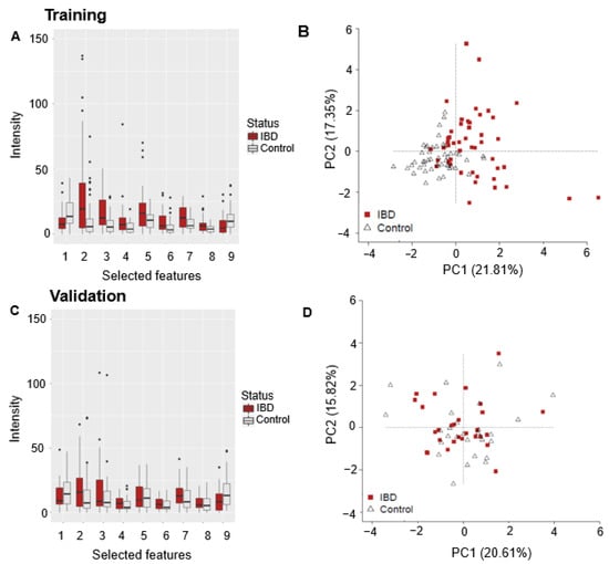 IBD vs. controls training and validation data. Boxplots of features selected by the model in the training set (A) and the same features used in the validation (C). PCAs based on selected features for both training (B) and validation sets (D).