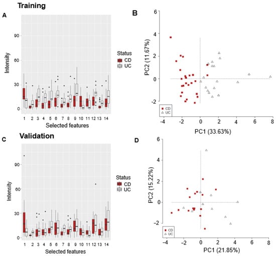 A further model was built to determine whether the GC–sensor VOC profiles could distinguish between CD and UC. A total of 14 features were selected by the training model to distinguish between CD and UC (Figure 4A,C), and 12 out of 14 features showed, on average, significantly different levels of abundance when comparing CD and UC groups, with consistent trends (directions) in the training and validation sets. The SVML followed by LOOCV had an accuracy of 73% (CI 69–77%) (80% sensitivity (75–85%)), 64% specificity (54–74%)) when distinguishing between CD and UC. The PCAs illustrating the separation of CD and UC based on model-selected features are shown in Figure 4B,D for the training and validation sets, respectively.
