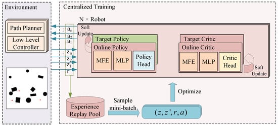 Figure 2 illustrates the framework structure of centralized training. The technique of DRL involves the selection of a goal point (action) to interact with the environment. A path planning algorithm and a low-level controller direct the robot toward the goal point. The robot scans the environment while moving, allowing for exploration. Simultaneously, the environment transmits the observations acquired by each robot to the centralized training framework. The centralized training framework records the actions, observations, and rewards of each encounter with the environment in the experience replay pool and samples mini-batches for training. In the figure, MFE denotes the Transformer encoder-based map feature extractor, and MLP is the multilayer perceptron. z is the joint observation information, r is the reward value, and a is the joint action. Every robot was equipped with a path planner and a low-level controller within the environment. The obstacles in the environments involved in this paper were static. During training, the A* path planning algorithm [] (a path planning algorithm for environments of static obstacles) was used, and the kinematics and dynamics model of the robots, as well as the collisions between the robots, were not taken into account to increase the training speed. It was assumed that the robots could rigidly follow the programmed pathways. The A* path planning algorithm was utilized during simulation tests to plan the global path. In contrast, the Timed-Elastic-Band (TEB) local path planner [] was used to plan the local path and provide control signals to direct the robot’s movement.