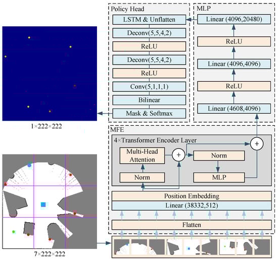Figure 3 shows the network structure of the policy net. Position Embedding refers to sinusoidal position embedding, while Norm refers to layer normalization. Linear refers to a layer that performs linear transformations. The values in the parenthesis indicate the dimensions of the input and output, respectively. Unflatten refers to rearranging data from a one-dimensional format into a three-dimensional one with dimensions of 5 × 64 × 64. Deconv refers to the operation of transposed convolution. The numbers enclosed in parentheses represent the dimensions of the input features, output features, kernel size, and stride size. Conv refers to a convolutional layer. The values in parentheses hold the same importance as those in transposed convolution. Bilinear refers to bilinear resampling for a final image size of 222 × 222 pixels. A mask selectively filters the prospective target’s location within the action space. The map consists of different sections: the white area represents free space, the gray area represents unknown space, and the black area represents obstacle space. The green dots indicate the robot’s current position, and the red dots represent potential target positions that might be chosen (action space). The blue dots on the map represent other robots within the communication range, while the blue squares represent their target positions. This network’s input data size is 7 × 222 × 222. These seven data layers correspond to the unknown space, the free space, the obstacle space, the robot’s position, the action space, the position of other robots within the communication range, and the target points of other robots within the communication range. The input data are evenly divided into nine parts according to the line drawn in the figure. MFE unfolds these nine parts into one-dimensional data and performs position embedding after mapping them through a linear layer. In this paper, the position embedding method was sinusoidal position embedding. The data are fed into the MLP after passing through the Transformer encoder layer, which consists of 4 layers. The Transformer encoder layer consisting of 4 layers is input into the MLP. The model dimension of the Transformer encoder is 512, and the number of heads in the multi-head attention layer is 8. In the policy head, a Long Short-Term Memory (LSTM) network first allows the robot to memorize some previously communicated information about other robots, such as implicit expressions of other robots’ intentions. After that, the one-dimensional data are reconstructed into five layers of 64 × 64 two-dimensional data, which are transformed into one layer of 222 × 222 two-dimensional data through a series of transposed convolutional layers and resampling. After a mask operation, we filter out the data in the action space through a softmax layer to obtain the action probability distribution.