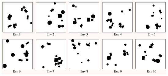 The training environments were generated randomly, following the following process. A circular boundary with a width of 1 pixel was positioned along the perimeter within an empty area measuring 222 × 222 pixels. The resolution of the generated environment was 0.1 m per pixel. Subsequently, ten obstacles were distributed evenly and haphazardly over the area, with their shapes being randomly chosen among circles and squares. The radius of the circular obstacles followed a uniform distribution U(5,15). The side sizes of square obstacles followed a uniform distribution U(10, 30) and were randomly rotated. These obstacles could overlap. The resolution of the environment was 0.1 m per pixel. Using the abovementioned method, we randomly generated ten environments for training, as shown in Figure 5. Each environment consisted of ten randomly generated obstacles that could overlap each other.