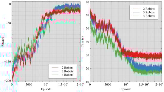 The change in the policy’s performance with the training process is shown in Figure 6. The left graph illustrates the variation in average rewards obtained by robot teams of varying sizes during their training process. The right graph shows the average time it takes for robot teams of different sizes to explore unknown environments through the training progresses. The training for each robotics team size required an average of 18 h. The network could be trained to reach convergence within 20,000 episodes.