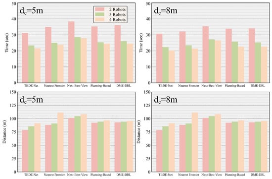 Figure 7 shows the time and distance spent by robot teams of different sizes using different methods to explore an unknown environment at two different communication distances. The TBDE-Net-based method outperformed other methods in both time and distance cost. Table 2 shows the time and distance traveled by each method to complete the exploration of the unknown environment. The experimental results show that the TBDE-Net-based, planning-based, and DME-DRL methods were insensitive to the variation in the communication distance. This is because both the TBDE-Net-based method and the DME-DRL method learn an implicit representation of the teammate’s state when communication is interrupted, and the planning-based method extrapolates the teammate’s current state from the state of the teammate before communication is interrupted.