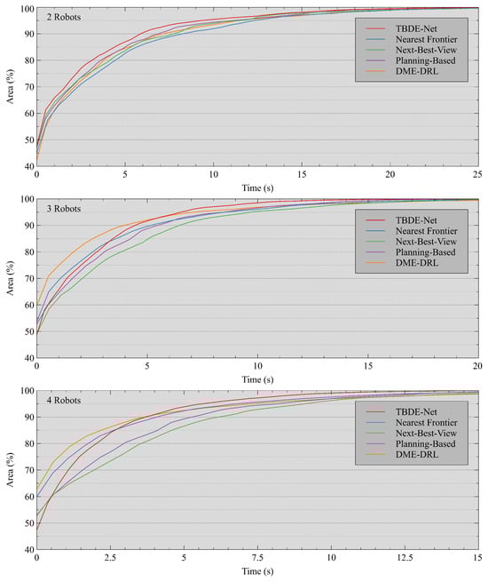 In the test, the robots used the move base package provided in ROS with the A* global path planner and the TEB local path planner to plan the path and control the robot’s motion. The robot used the Hector mapping algorithm to construct local maps from the data returned by the LiDAR. During the exploration process, TBDE-Net was used to select the target points. The local maps of each robot were spliced into the global map at the map splicing node, and the exploration was considered to be completed when there was no frontier unknown in the global map. We conducted ten explorations in a simulated environment, utilizing teams of robots consisting of two, three, and four robots, respectively. The beginning placements of the robots were randomized for each exploration.