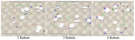 Figure 10 shows the paths traveled by the robots as three different-size robot teams completed their exploration of random unknown environments. The curves in the subfigures represent the paths traveled by the robots during exploration. The green points are the initial points, and the blue are the target points the robots passed during exploration. Table 3 demonstrates the test results with the nearest frontier method as a baseline. The experimental results show that TBDE-Net could explore unknown environments in a near-realistic simulation environment that considered the robot dynamics model, including its inertia and acceleration and deceleration processes.