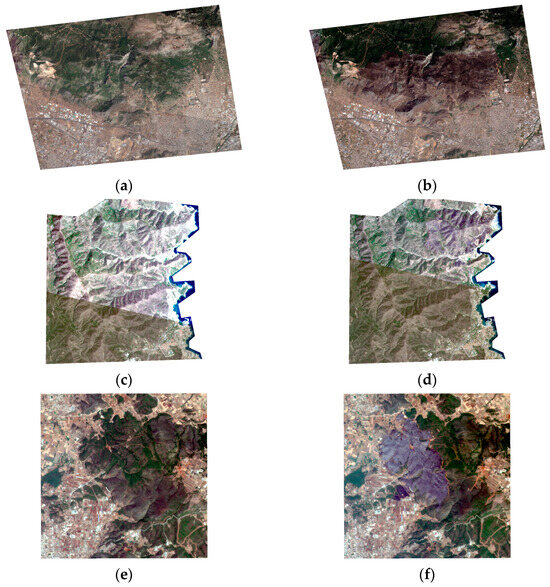 Figure 1 presents a side-by-side comparison of the pre-fire (first column) and post-fire (second column) images for the four distinct zones. Each row corresponds to a different location, illustrating the transformation of the landscape due to the fire event. As shown in Figure 1, comparing the pre- and post-fire images reveals radiometric differences between them. These differences are evident even within the image mosaic of the same day when acquired with different sensors (e.g., Figure 1c,d). Preprocessing for data harmonization could help balance the radiometric response of the images. However, to present a robust and automatic methodology and to test the characteristics of the SuperDove images, we decided not to perform this preprocessing. The effects of these radiometric differences are discussed in later sections. Also, Table 1 provides details of the image-capture dates for the four areas selected for the study.