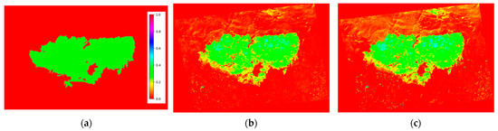 However, if the pre- and post-fire differences in the different indices that appear in Figure 5 are observed in detail and, especially, if they are compared with the delimitation mask of the burned area provided by the CEMS (Figure 5a), the information presented the MSR and SR indices (Figure 5f and Figure 5i, respectively) makes the process of obtaining a burned-area mask difficult. This degraded performance is probably due to the definition of these indices (Table 2), in addition to the spectral responses involved in their calculation in the case of changes in vegetation status.