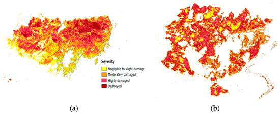 Finally, Figure 8 and Table 4 show the severity maps for each of the study zones, as well as the quantitative data on the percentage of surface area over the total fire-affected zone for each severity class. Quantitative analysis by visual inspection shows the coherence of the severity maps obtained with the proposed methodology and those observed in the CEMS reports. However, the quantitative analysis shows a substantial discrepancy in the surface percentages assigned to each of the four categories used by the Copernicus Service: negligible to slightly damaged, moderately damaged, highly damaged, and destroyed.