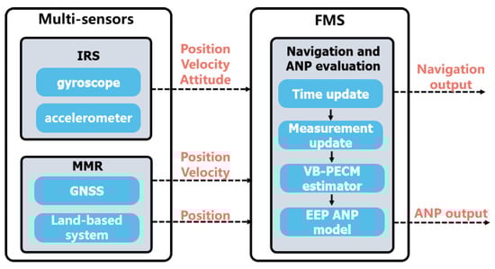 The structure of the proposed airborne integrated navigation system and ANP evaluation is shown in Figure 2. The FMS uses the inertial reference system (IRS) as the reference system and the GNSS and land-based radio system as auxiliary systems. The accurate PECM can be obtained using the proposed VB-based estimator, and by applying PECM to the 3D ANP model, the FMS can output a 3D-ANP evaluation result for civil aircrafts during RNP flight.