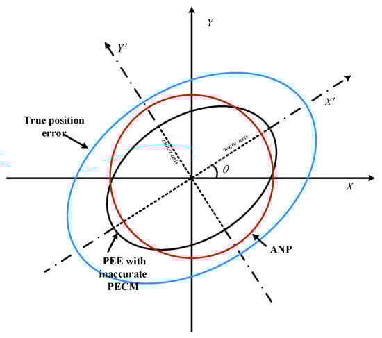 is the estimated error matrix (EEM) of the Kalman filter, which includes the position estimate error (PEE) of the airborne integrated navigation system. is the one-step prediction error matrix. FMS uses the PECM obtained according to as the ANP calculation input. PECM for the horizontal plane can be expressed as follows: