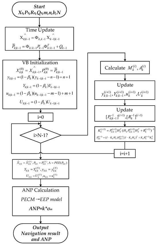 The Kalman filter is the optimal recursive linear variance estimation algorithm with accurate and values. However, active FMS empirically sets and according to the sensor error characteristics. As shown in Figure 3, such customized parameters cannot reflect the changing characteristics of uncertain noise [19]. The use of inaccurate and values will result in substantial estimation errors in the PECM, leading to misevaluation of ANP. Therefore, a novel VB-based PECM approximation method will be proposed.