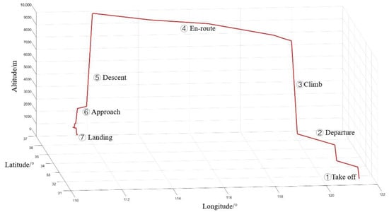The RNP flight procedure from Shanghai Hongqiao International Airport (ZSSS) to Chengdu Shuangliu International Airport (ZUUU) is executed in the simulation. The aircraft’s flight trajectory is dynamic, taking full account of the aircraft’s maneuverability, comprising five phases: takeoff, climb, steady flight, turn, descent and landing. The initial position is 31.1967° N, 121.335° E at an altitude of 8 m; the initial heading angle is 175°; and the arrival airport is 30.58° N, 103.948° E at an altitude is 495 m. The simulation duration is 10,505 s. The fly track simulation output is shown in Figure 6.