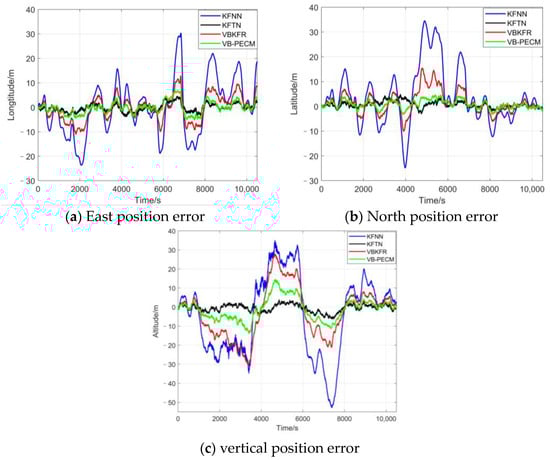 Figure 7 shows the comparison results of the position-estimated error of the FMS in the east, north, and vertical directions of the different algorithms.