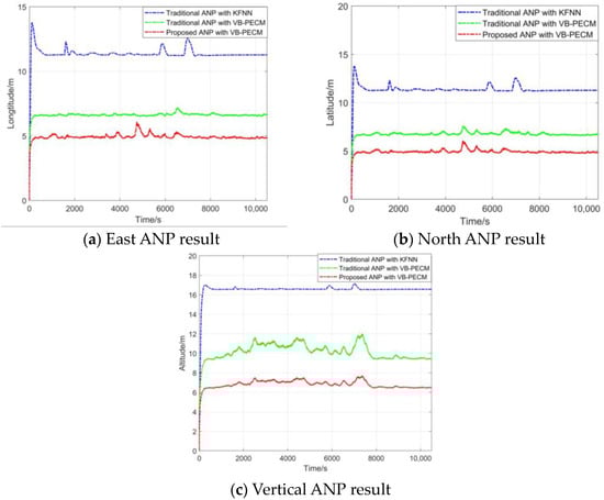 Based on the above simulation results, it can be seen that the proposed VB-PECM filter has stronger adaptability to time-varying unknown noise. The proposed VB-PECM filter not only improves the accuracy of positioning but also the estimation accuracy of the PECM. Combined with the 3D ANP model proposed in this paper, the ANP evaluation is more effective. The evaluation accuracy in the east direction is 60.7% higher than the traditional ANP with KFNN, and it is 38.8% higher than the traditional ANP with VB-PECM. In the north direction, it is 55.8% higher than the traditional ANP with KFNN and 39.7% higher than the traditional ANP with VB-PECM. In the vertical direction, it is 56.9% higher than the traditional ANP with KFNN and 31.7% higher than the traditional ANP with VB-PECM.