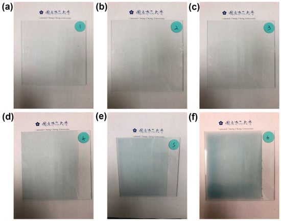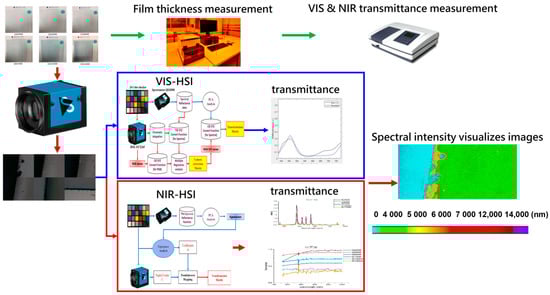 The present study used the vacuum sputtering method to deposit various film thicknesses (4000 nm, 5000 nm, 6000 nm, 7000 nm, 12,000 nm, and 14,000 nm) onto Low-E glass. The specimens used in this study were labeled as G4000, G5000, G6000, G7000, G12000, and G14000, according to their respective thicknesses, as seen in Figure 1a–f. Figure 2 shows the whole process of this study. In this experimental study, six clear film glass samples with varying thickness values were subjected to measurement. To verify the thickness of the glass film, the first procedure involves using a surface profilometer (KLA-Tencor D300 Profiler, KLA, Zhubei City, Taiwan, Figure S3 in Supplementary File) to assess the surface profile and ascertain the precision of the glass film’s thickness. In the subsequent stage, A dual-beam spectrophotometer (CT-8600, Chrom Tech, Taipei, Taiwan, Figure S4 in Supplementary File) is used to quantify the transmittance of the VIS and infrared (IR) spectral bands, therefore acquiring the distinctive properties of each glass film in terms of their VIS and NIR transmittance. These processes can build up the gold sample database for the connection between the thickness and spectrum of the samples. The different thickness samples can generate principal component analysis (PCA) regions. These regions can be used as a basis for judging the thickness of the samples. The third phase involves the use of VIS-HSI (visible hyperspectral imaging, 380–780 nm) and NIR-HSI (near-infrared hyperspectral imaging, 780–1100 nm) technologies to acquire simulated spectral data spanning from VIS to NIR bands. Finally, the NIR spectral data are employed to quantify the thickness of the transparent glass layer, therefore acquiring the spectrum intensity of NIR light transmittance. A glass film detecting system is developed using custom color planning based on the signal intensity of NIR spectral transmittance. The data acquisition system integrates an RGB camera, a SWIR camera, and spectrometers. The RGB and SWIR cameras capture spatial information across distinct wavelength ranges, while the spectrometers yield accurate spectral data. This integration allows us to restore HSI data with a combination of excellent spatial and spectral resolution. This approach utilizes the advantages of both camera systems and spectrometers to accomplish thorough hyperspectral imaging (HSI) data collection.