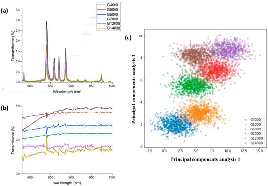 Optical microscopy (OM, (MM40, Nikon, LinTrading Co., Taipei, Taiwan)) was used in this experiment to capture images, which were then entered into the NIR-HSI analysis. Figure 3 illustrates the process of spectral modifications and corrections critical for accurately determining glass thickness. Each image produces unique spectral data, as seen in Figure 3a, illustrating the spectral modifications before correction. Since NIR-HSI data mostly represent spectra that are transmitted, it is necessary to remove the impact of the light source. Figure 3a presents the raw transmittance spectra of glass samples with varying thickness values (G4000, G5000, G6000, G7000, G12000, G14000) across the wavelength range of 800 nm to 1000 nm. These raw spectra show distinct peaks and variations in transmittance levels, which need correction to account for inherent spectral features and noise. This ensures that only the transmitted NIR spectral fingerprints are retained, as shown in Figure 3b. Figure 3b shows the spectral data after applying correction techniques to normalize and standardize the transmittance values. The normalized method is the spectrum of Figure 3a divided by the spectrum of glass without coating and containing the xenon lamp light source. This correction reduces noise and enhances clarity, resulting in more consistent and distinguishable features that correlate with glass thickness. The post-correction spectral curves demonstrate improved precision, making it easier to identify the specific characteristics associated with each thickness level. After being normalized, the corrected spectral information improves the clarity in differentiating the distinctive intensities included in the transmitted spectra. Through the examination of the post-corrected spectral data characteristics, each data point in every image, totaling 144,000 pixels, is analyzed. The method leads to the formation of scatter plots that show the variation in thickness for six various values of coated glass. This is seen in Figure 3c. These data confirm the capabilities of NIR-HSI technology to distinguish among samples in transparent thin films. Figure 3c displays the results of PCA applied to the corrected spectral data. PCA reduces the dimensionality of the data, extracting significant features and plotting them against the first two principal components. This visualization effectively clusters the data points based on glass thickness, showing clear separation between clusters corresponding to different thicknesses. This indicates that PCA has successfully captured the relevant spectral features for thickness estimation. The transformation from raw to corrected spectral data, followed by PCA, underscores the necessity of intermediate modifications. These steps enhance the accuracy and reliability of thickness measurements, demonstrating the importance of spectral corrections and feature extraction in our methodology. This process ensures precise and consistent data analysis, vital for the accurate determination of glass thickness.
