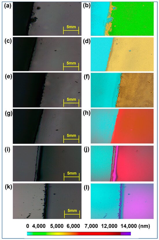 This research aims to analyze spectra from thin glass sheets of different thicknesses using NIR-HSI technology. Figure 4 demonstrates the depiction of sample thickness by matching each spectral band with the appropriate changes in thickness, based on spectral disparities. Figure 4a,c,e,g,i,k show the OM images of the samples. Figure 4b,d,f,h,j,l display the visualization results of the samples, specifically showing the thickness of the images. The uncoated glass substrate is shown in a bright blue color on the left side of each image. In Figure 4b, the colors representing each spectral band (green) are used on the right side, showing noticeable differences in color for thicker and uneven coatings. Furthermore, a spectrum of orange shades becomes visible at the boundaries of the coatings due to variations in thickness. Figure 4b–l provide a consistent pattern, highlighting how the combination of NIR-HSI and visualization approaches simplifies and improves the identification of thin film thickness.