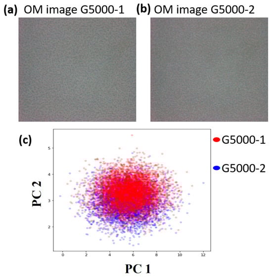 (a) OM image of G5000-1; (b) OM image of G5000-2; (c) overlapping red and blue spectral characteristics of two samples.