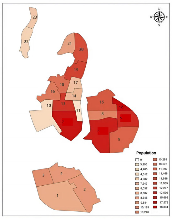 First, the population distribution in the Old Town area was projected. The Old Town area has a population of about 107,800 and is divided into 11 transportation districts, and the distribution of residential population in each transportation district is shown in Figure 1.