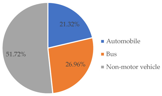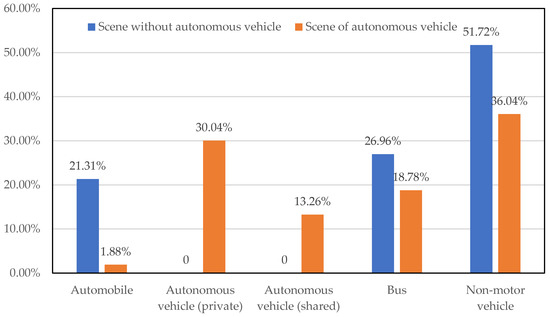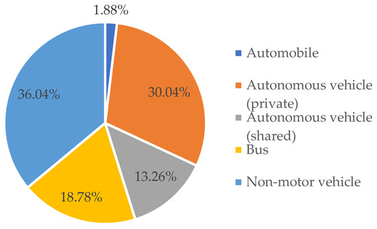 In the context of autonomous driving, the percentage of people who use cars as their commuting mode has increased to 45.18% (Figure 3). Among the group of people who choose autonomous driving vehicles as their commuting mode, private autonomous driving vehicles have become the preferred option, accounting for 30.04% of the vehicle share, while shared autonomous driving vehicles account for 13.26%.