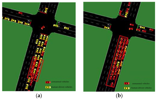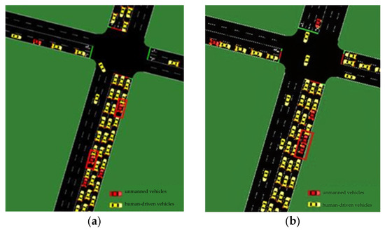 Visualizations of the simulation scenario for the rate of unmanned vehicles in the traffic flow of 10% (a) and 20% (b).