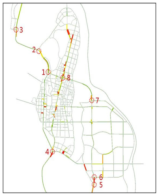In the road network, there are eight distinct congested nodes, as shown in Figure 8. Nodes 1–7 are nodes connecting the area to the urban corridor, while Node 8 is an important node for north-south and eastward traffic.