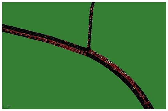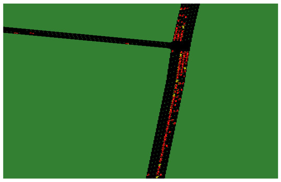 The road network and peak hour OD data for the selected areas were obtained from the ‘Qingdao Urban Traffic Management Planning Project’. The peak hour OD data were obtained from the 2030 land use plan and local population projections for the selected areas. Analysis of the full simulation model results indicates that unmanned vehicles can effectively improve traffic efficiency and better meet local transport needs when operating in groups. As the penetration rate increased from 0% to 10%, the average delay, average waiting time, and average traveling time increased, while the average travel speed decreased. Observing the modeling process revealed that, as the proportion of unmanned vehicles in traffic flow increased from 0% to 10%, the number of human-driven vehicles remained high. Additionally, most unmanned vehicles appeared singly on the road network (see Figure 5a). This resulted in reduced traffic efficiency, as the unmanned vehicles cannot be utilized to improve the overall traffic flow and may even interfere with human-driven vehicles.